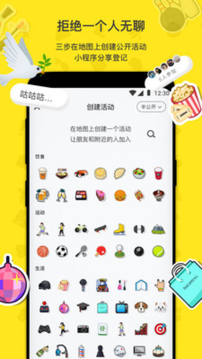 三步创建一个活动在地图上显示,让朋友或附近志趣相同的新朋友加入。