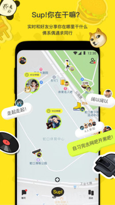 ·正在图书馆自习?一个人准备去食堂吃饭?还是想找人一起打球/看电影/喝啤酒/吃火锅/开黑吃鸡/狼人杀?用撒噗(Sup!)与好友限时分享你正在哪里、在干什么