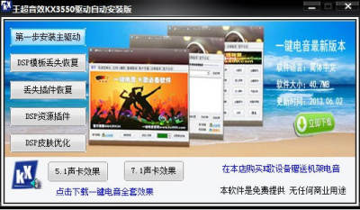 KX3550驱动自动安装版本,支持创新5.1和7.1声卡,注意:不支持集成声卡,一键式操作,方便新手,下载好了,安装之前请先退出杀毒软件,软件是绿色软件无病毒,预防杀毒软件拦截安装,