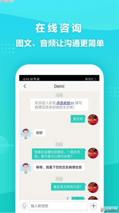 【健康咨询】提供医患间在线咨询需求,实现在线即时沟通,支持文字、语音、图片、视频多种交流方式;