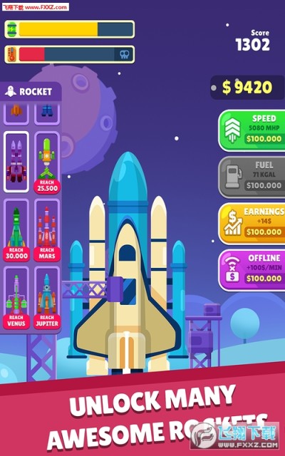 Idle Rocket官方版》是一款色彩明亮的休闲益智类游戏,游戏中玩家将管理火箭发射,用火箭去探索太空中的星球,从不同的星球上获取不同的资源,用获得的资源不断购买更好的火箭,探索更多的星球获得更多的资源,快来经营你的火箭帝国吧!