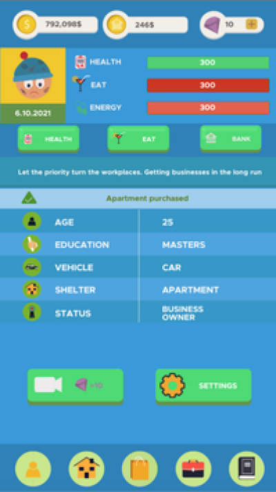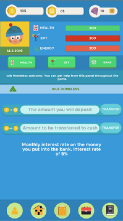 游戏中玩家一开始是一名食不果腹的流浪汉,你要去找工作,慢慢的积累一点金钱,存入银行获得利息,拿出一点来去购买食物,不断的工作,投资,积累你的资金,然后你可以去开公司,聚集更多的财富,成为大富豪。