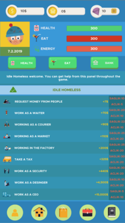 你想从头开始生活并走向顶峰吗?闲暇无家可归为您提供无家可归的生活。如何指导这个无家可归者,你如何以最快的方式度过职业生涯的巅峰你永远不会知道你将会遇到一个简单的生活模拟器。您希望如何发展取决于您。如果你想成为一名女服务员,就可以获得一些非法商业资金。