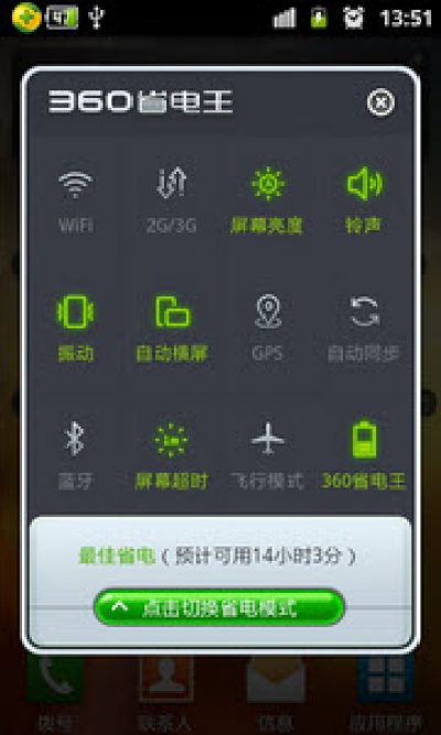 想快速关掉wifi?晚上想调一下屏幕亮度?开会想立即静音?用完地图导航想关闭GPS?没问题!您只需要点一下360省电王的桌面快捷开关,一键通通搞定,给您最便捷的系统设置。