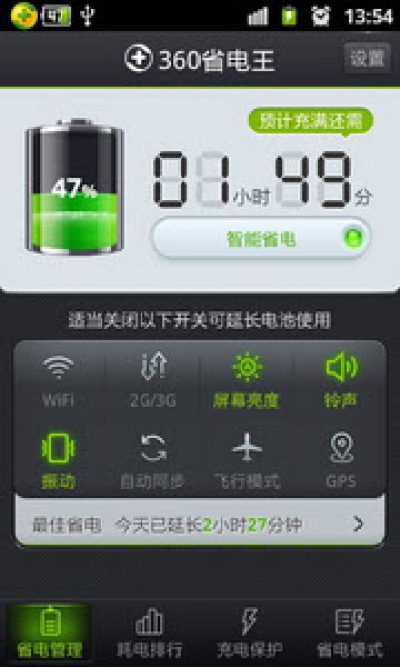 还在为不知电量能够使用多长时间而担惊受怕吗?360省电王精准预测电池可用时间,帮您精打细算,合理分配剩余电量使用,不再为关键时刻电量不足而感到尴尬。