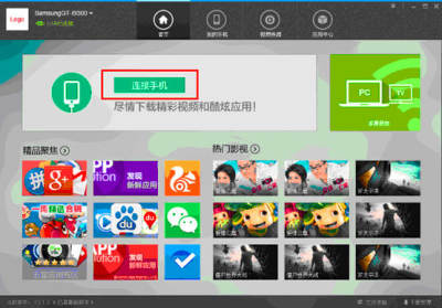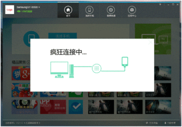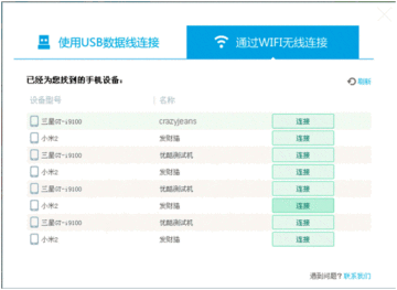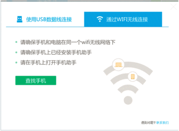 点击客户端首页“连接手机”按钮,开始进行连接,您可以选择USB连接、WI-FI连接两种连接方式,USB连接就是通过数据线连接,wif连接通过无线网络进行连接,首先我们来看一下USB连接: