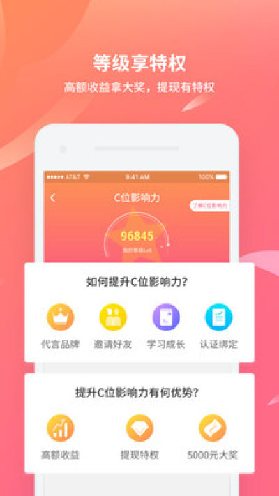 【等级赚-C位出道享收益】达人可以在社区完成阅读学习,打卡,收徒等等一系列的任务来提神自己的C位等级,等到C位等级到达一定级别,便可以获取高额的现金奖励,也可以直接出通告C位出道。