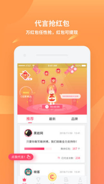 红包大派送-天天抢代言红包】达人们可以一切成为品牌的代言人,通过自身的影响力,利用微信,QQ,微博,贴吧,论坛为品牌带来价值从而获取品牌给的现金红包。