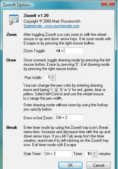当您第一次运行ZoomIt,它将弹出一个配置对话框,描述ZoomIt能做什么,让你指定热键来更方便的进入缩放或标注功能,而且还能够自定义绘图笔的颜色和大小。例如,我可以用标注功能标注屏幕上的问题。ZoomIt还包括一个定时器功能,当你从定时器窗口切换出来它甚至仍然是可用的,并且,你还可以通过点击一下ZoomIt托盘图标再返回到计时器窗口。