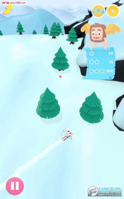 2、危险的地图上,散落大量金币,操控野人穿梭在树林之间,收集金币,无限升级野人的滑雪能力。