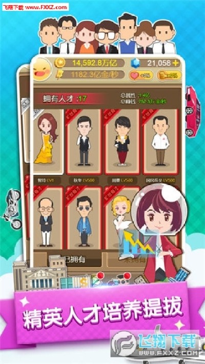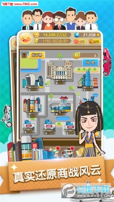 1、精美的游戏画面,Q版可爱的卡通风格,休闲点击放置类型的玩法,让你轻松成为集团CEO;