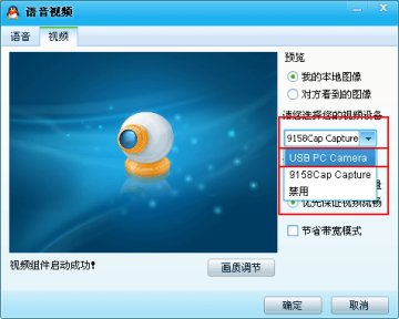 第三步:在语音视频设置对话框里,选择要使用的视频设备,点击确定后完成设置。