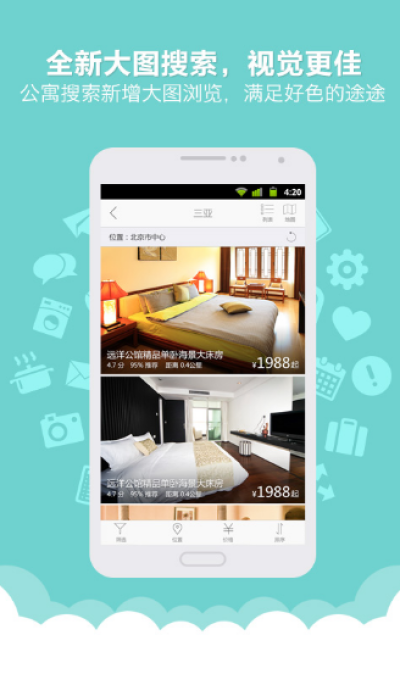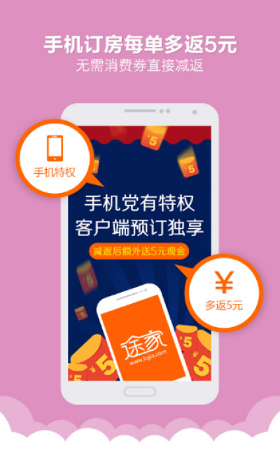 途家android客户端,带来全新的用户体验和更加方便预订支付功能,首屏的“首页”“目的地”、“搜索房屋”、“优惠专区”“我的”及LBS定位功系统更方便用户浏览搜索合适房源、享受优惠及订单情况的查询管理。全新移动客户端让用户的出行住宿安排更加方便快捷。用手机预订途家公寓,享受三倍于普通预订积分,积分更可用于抵扣房费,可以减少用户的开支!