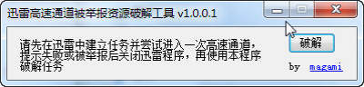 而迅雷高速通道被举报资源破解工具,是一款能让会员可以突破被举报了的资源能正常使用高速通道功能,让你的高速下载不受限制,由网友 magami 制作分享!