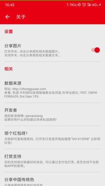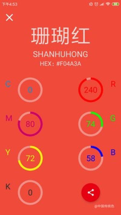 中国传统色是一款着力于推广中国传统色彩的配色工具。中国传统色收录了中国传统颜色的详细数据,色谱来源中科院科技情报编委会名词室科学出版社,APP提供色值的搜索功能,以及颜色CMYK、RGB、HEX相关数据,提供分享色值以及分享颜色截图功能。