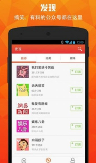 发现:帮你发现最搞笑、最幽默、最有料、最实用的微信公众号,搞笑、娱乐、健康、时尚、科技、旅游等18大类别任你选