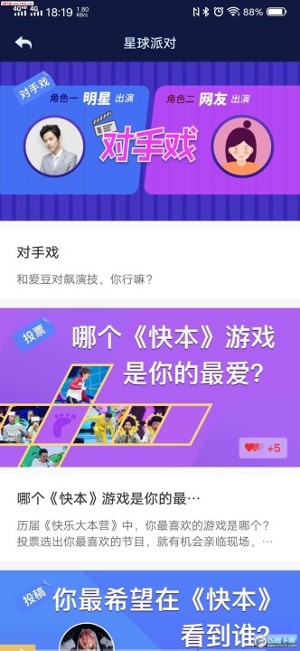 【快乐星球】是一个由明星携手粉丝一起,搭建明星与粉丝之间高频率互动的娱乐平台,为用户打造轻松愉快的正能量app。作为快乐大本营官方APP,集中了众多明星,在这里,关注你喜欢的爱豆,可以和爱豆一起,以活动任务为纽带,不断升级爱豆和粉丝之间的亲密关系,为爱豆和粉丝建设正能量的,理想型的星球家园。
