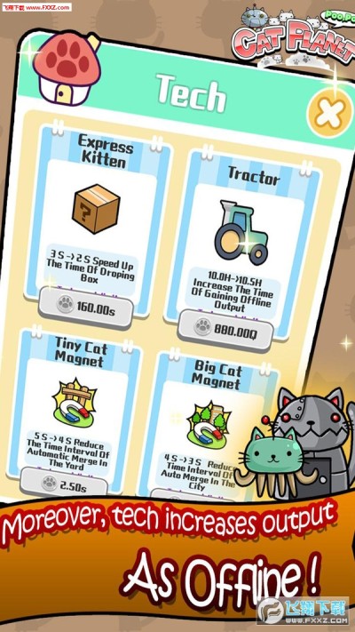 更高的技术水平意味着离线时收入更高,更快地获得新品种的猫。