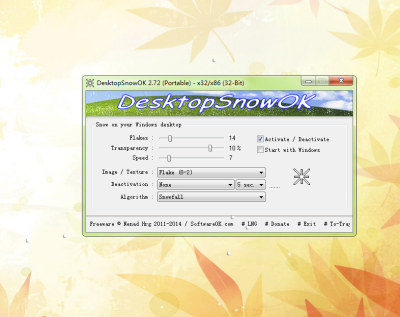 DesktopSnowOK是一款有趣的软件,可以使桌面上飘起漂亮的雪花,而且还可以根据自己的喜好,调整雪花的大小、数量、速度等。
