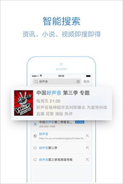 智能搜索:搜索爸爸去哪儿、中国好声音等热词,直接呈现最优结果,让你更少输入、更快抵达