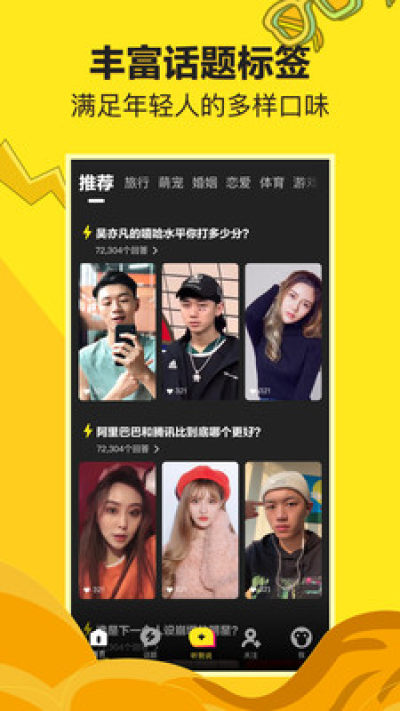 2、话题标签:围绕时事热点娱乐等内容,细分标签满足年轻人多样口味