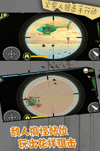 火柴人狙击手行动是一款3D射击游戏。每颗子弹都会在火柴人狙击队史诗般的故事上留下浓墨重彩一笔。这一次,世界级的狙击手大卫和突击专家瑞奇在执行一个拯救世界的自杀性任务。踏上极度危险的征程,在全球执行各种难以想象的危险人物,书写超越颠峰的传奇故事。在成群的坏人当中杀出一条血路,或者从容不迫远距离干掉他们。每个任务都需要独特的方法,但是目的只有一个:干掉敌人。