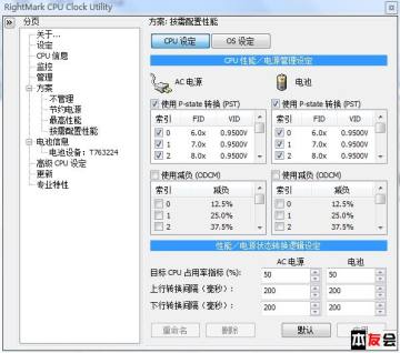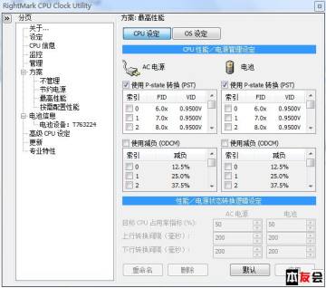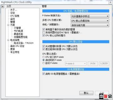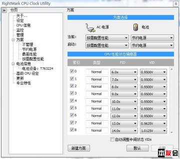 b>“方案”-“节约电源”,分为“CPU设定”和“OS设定”,“OS设定”就是windows的电源管理整合进来了,可以不用管它。“CPU设定”包括“AC电源”和“电池”,勾选“使用P-state转换”,然后分别选择“AC电源”和“电池”时CPU最低功耗的频率(只能选一个倍频)。那么全部设置完毕后使用“节约电源”时,CPU就会始终运行在所选的频率上。