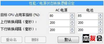 d>“方案”-“按需配置性能”,界面和“节约电源”一样,设置稍有不同,“使用P-state转换”下的倍频选择是复选式,即可以选取多个,方案使用后CPU会按需运行在各个所选的倍频下。需要注意的是在此界面下“性能/电源状态转换逻辑设定”被激活,我们需要对其中的一项做出改进——“目标CPU占用率指标”。这一项是指当CPU使用率超过多少时倍频上调到更高,默认是50%,为了达到使CPU工作在尽量低的频率和电压下的目的,这个值需要调高,AC模式在80%即可,电池模式可以再高些到85%,如果再调高了就可能影响性能了。