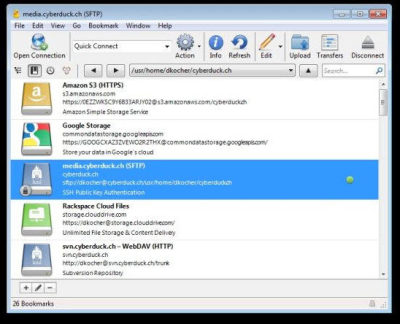 Cyberduck是开放源代码的FTP及SFTP软件,基于GPL授权,拥有简单的操作界面,支持WebDAV 和 Amazon S3 浏览与文件的传输等。