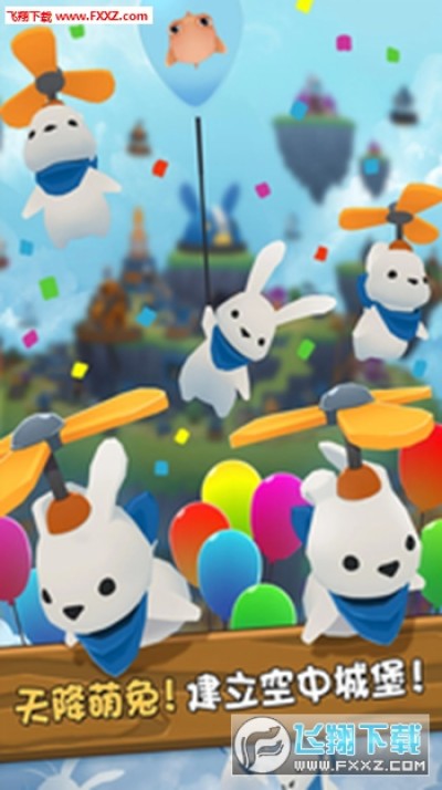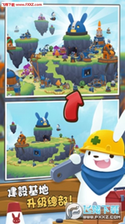 - 点击画面生产金币,升级萌兔总部,解锁装备设施,建造萌兔天空城!