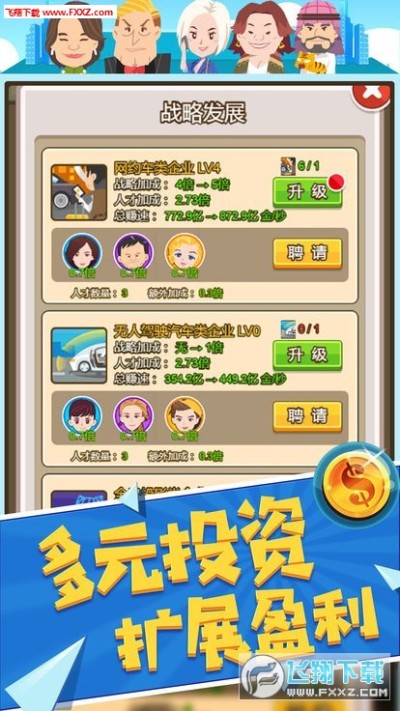 亿万大亨安卓版》是一款现代卡通风格的模拟经营类手头,游戏里玩家可以缔造自己的商业帝国,从零开始创业招募员工不断的发展,赚取金钱来升级公司投资更多的项目,还可以和其他的企业一起联合,享受亿万富翁的快感!