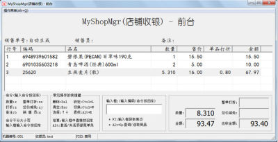 2.命令:修改商品数量:s;单品打折:z;备注:b;整单打折:zz;总价减免:zj;输入销售员:x。(输入框中输入命令按回车,大小写不敏感)