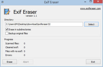 解压缩所下载的档案,执行「exiferaser32.exe」便可开启,无须安装。开启后,点击[select]来选择相片的所在资料夹;若需要备份原始图片,记得要勾选[Backup original files];无误后,请点击[Erase]。