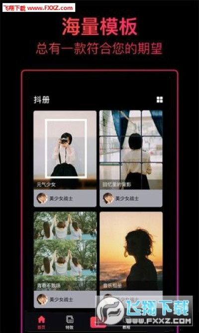 【特效模版】 -添加视频或图片,一键即可生成精彩视频,模版包括音乐卡点、相册MV、创意趣味等 -主题包含亲情、爱情、萌宠、宝贝、节日、美食、个性、时尚、趣味、简约、回忆、美好时光等