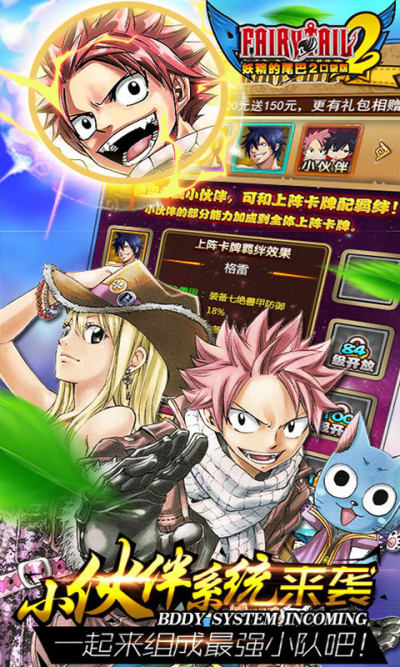 妖精的尾巴2是根据超人气动漫《妖精的尾巴》改编的回合制手游。游戏以原版动漫风格震撼亮相,配合新奇多样的玩法、新颖的战斗模式(战斗时可操作释放技能)让《妖精的尾巴2》华丽升级,惊心动魄原版故事情节,超高水准的重现了原作中的妖精尾巴公会任务剧情,游戏中精致的画面和酷炫的战斗技能,完美全诠释新生代卡牌游戏特点,让我们在丰富多彩的妖精尾巴公会中享受每一项伟大事业!