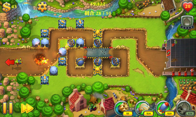 火花塔(射线塔):可向8个方向发射射线,一次只能4个方向,擅长对付桥梁附近的绕圈敌人。1级160伤害/秒,2级320伤害/秒,3级480伤害/秒,范围正方形3*3。