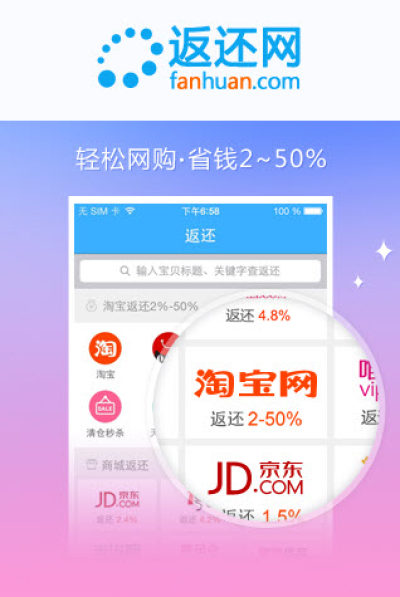 这是返还网的手机客户端安卓版,是淘宝、京东、美团和携程等网站的重点合作伙伴。大家只需打开手机就可以享受淘宝、京东、美团、携程等800多家商城的购物现金返还,给大家节省大量的开支,带给大家不一样的购物享受!