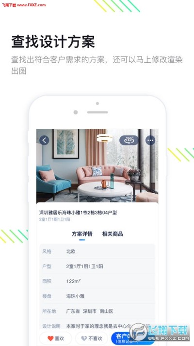 2.查找设计方案。海量的方案库,可以根据客户真实需要,查找出符合客户装修风格和户型的设计师精选方案,还可以在手机上修改方案并出图;