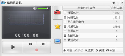 目前包括国内、国外、网络电台等共855个电台列表,支持边听边录。自定义皮肤颜色,并且支持透明皮肤。与众不同的是酷狗网络收音机可以在您收听某个电台中播放的歌曲时,它可以智能识别此歌曲的名字,并予以搜索下载。