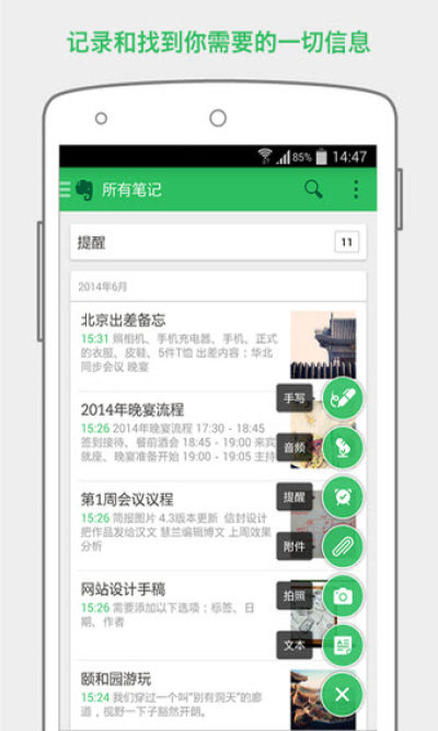 可以说是几乎每个电脑用户都应该知道的应用程序。它是个跨平台的笔记应用程序。现在也有针对手机的移动客户端了,比如Windows mobile手机、android手机、iPhone、或者诺基亚智能机等等。Evernote安卓版手机版中文版破解版可以在任何地方记下笔记,浏览以前的笔记,除了一般的文本笔记以外,你还可以创建声音笔记、上传文件,或者截取屏幕截图。最吸引人的是Evernote安卓版手机版中文版破解版的图片识别功能,图片中的文字都可以被搜寻到。然而只有 一点限制;有月流量限制。