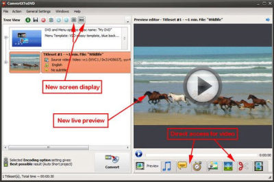 ConvertXToDVD是一款支持刻录功能的视频文件转换软件,允许从各种视讯格式建立DVD,并使用DVD播放器播放到电视上观看。ConvertXtoDVD 的设计使您不用去思考任何复杂的事,新增一个或多个视讯档案,然后插入一片空白 DVD,您的影片将被自动转换与烧录到光碟上 (完整保留章节与选单),并且不需要额外的解编码器,详细资讯请参考支援连结。