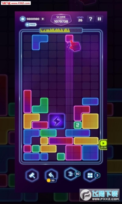 音爆方块无限金币版游戏以经典俄罗斯方块玩法为主,你可以任意变换下降的图形,完成整行就可以消除,消除的越多你的分数就越高,可以不断解锁更多关卡,越到后面就越难,操作轻松易上手,你可以尽情挑战你的极限,后面下降速度会越来越快,考验你的反应能力和手速。
