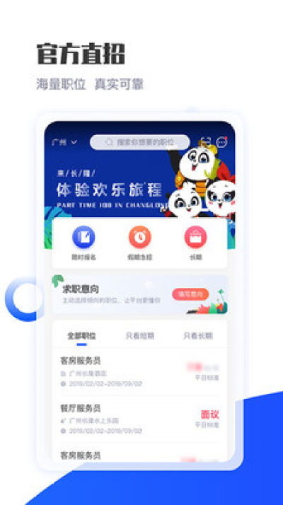 长隆集团2019年全新上线平台,支持搜索长隆集团各单位的岗位信息,轻松投递简历,接受面试、入职等通知;同时支持面试入职签到,考勤打卡,一键完成。