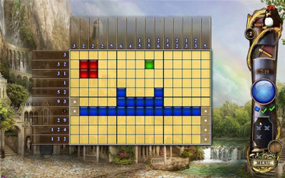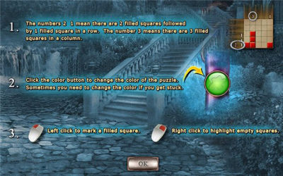 数图游戏是由方格区和方格区之外的数字组成,每一行方格的前面以及每一列方格的上面都会存在一些数字,这些数字代表着当前行或者列中所要填充的方块数量,比如某一行前面存在2和1两个数字,那么这一行应该要填充三个方块,并且会有两个连续的方块在一起,两个连续方块应该填充在左面(不一定),空一个方格或者多个方格之后才能填充单独一个方块。如果某一列上面依次存在5和4和2共三个数字,那么该列从上至下的方格填充区需要填充十一个方块,其中五个连续的方块填充于偏上位置,至少空一个方格之后填充偏中位置的四个连续方块,再至少空一个方格之后填充偏下位置的连续两个方块,注意前面所讲到的空方格,这个所要空出来的方格数量是推理出来的并不绝对是一个方格,有可能是两个,有可能是三个,或者是更多。如果玩家已经确定了某个方格一定是空的,那么你可以用鼠标右键点击一次该方格,那么就可以做出白色圆点的标记。