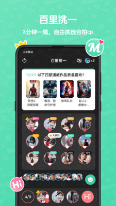 【百里挑一】3分钟一局,12位男生与12位女生同场在线匹配,基于共同三观和爱好等选择匹配后自由挑选cp对象。