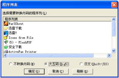 3.你这个时候打开游戏程序,在内码转换器中刷新一下,再选择“游戏程序名字”和“大五码”,点确定即可