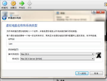 运行VirtualBox——新建——下一步——操作系统选择Mac OS X,版本选择Mac OS X Server(64bit)