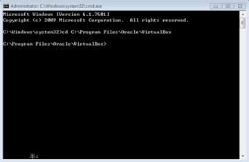 使用cd 命令跳至VirtualBox的安装位置。例如我的VirtualBox安装在C:\Program Files\Oracle\VirtualBox,故输入cd C:\Program Files\Oracle\VirtualBox,回车即进入。