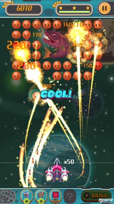 游戏中玩家操作飞机在太空战斗,利用武器将外星人击灭
