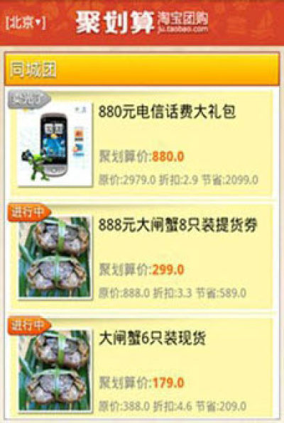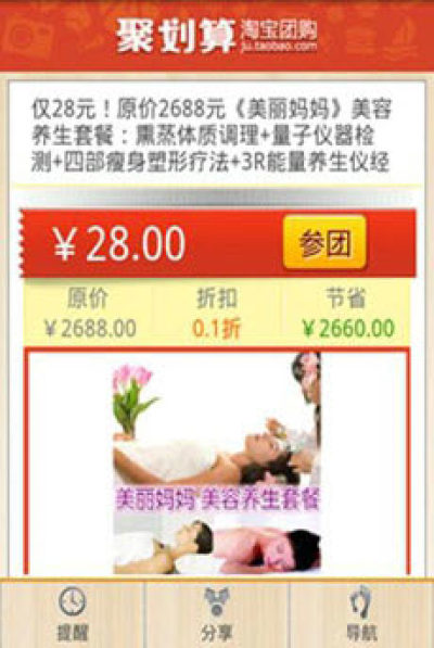这是聚划算的手机客户端,大家只需打开手机就可以了解海量的淘宝团购信息。作为阿里巴巴旗下的团购网站,聚划算给大家提供了各种优质的团购商品,都是经过广大的用户朋友检验后评价较好的,相信一定会让大家满意!